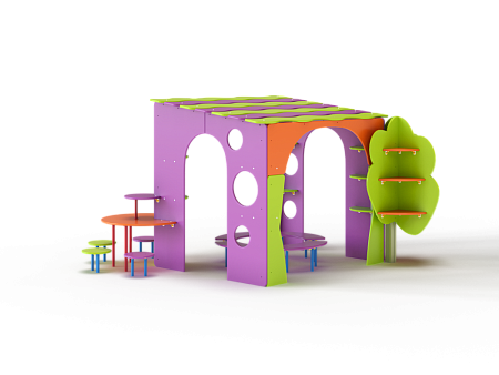 ДОУ 5.04 предназначен для организации занятий с детьми в летний период, с группой детей или по подгруппам. Скамейки внутри беседки позволяют удобно разместить подгруппу детей при организации бесед, чтения художественной литературы, занятий с педагогом-психологом. Беседка многофункциональна, в ней удачно сочетаются полки для размещения пособий, книг, иллюстраций, столы различных размеров для рисования, упражнений для развития мелкой моторики рук. Крыша беседки выполнена из специальных волнообразных панелей, расположенных на расстоянии друг от друга для естественного освещения и дополнительной вентиляции, для размещения пособий для дыхательной гимнастики. Сквозные отверстия разного диаметра и горизонтальные прорези носят не только декоративный характер, но могут использоваться для оформления выставок детских работ. Отсутствие стенок делает доступным для детей каждый из предметов.