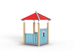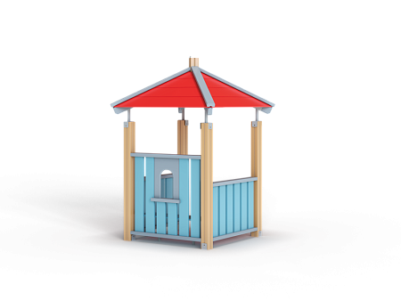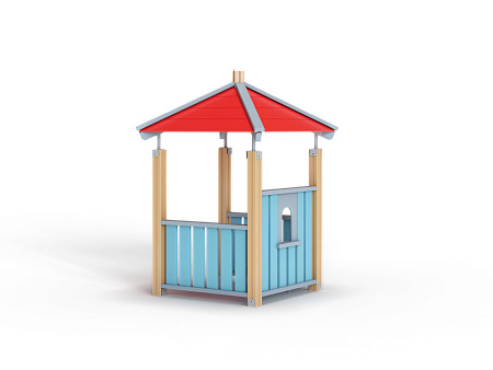 Домик состоит из башни с четырёхскатной крышей и трёх ограждений из бруса.