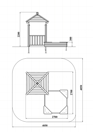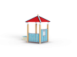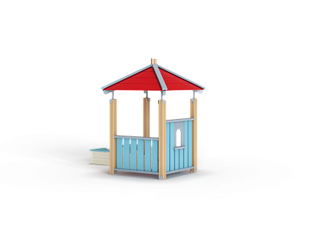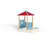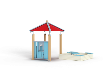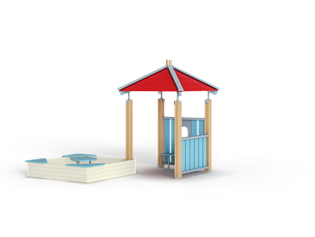 Домик состоит из башни с четырёхскатной крышей, двух ограждений из бруса и песочницы из бруса с трёмя фанерными угловыми накладками.