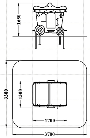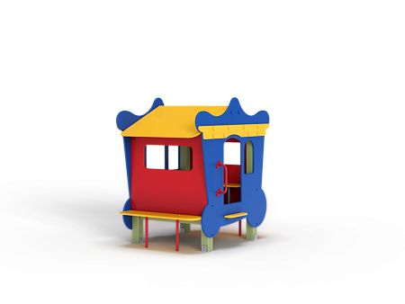 Домик стилизован в виде кареты, состоит из башни с крышей, ступенек, ограждений в виде деталей кареты, скамеек.