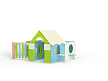 Лабиринт состоит из четырех секций (одна из них с крышей) разделенных фанерными ограждениями с круглыми и арочными лазама. Со стороны улицы крепятся столики и ступеньки.