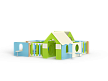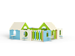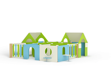 Лабиринт состоит из девяти секций (две из них с крышами) разделенных фанерными ограждениями с круглыми и арочными лазама. Со стороны улицы крепятся столики и ступеньки.