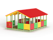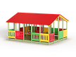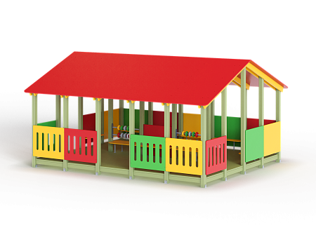 Беседка состоит из площадки с крышей, скамеек по периметру и в центре, двух комплектов детских счет, ограждений фанерных сплошных и с вырезами.