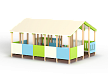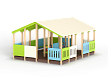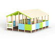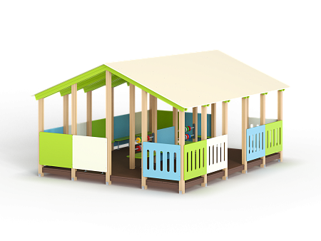Беседка состоит из площадки с крышей, скамеек по периметру и в центре, двух комплектов детских счет, ограждений фанерных сплошных и с вырезами.