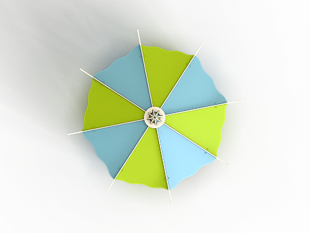 Домик состоит из восьмигранной башни с крышей в форме пагода, семи фанерных ограждений и скамеек.