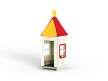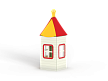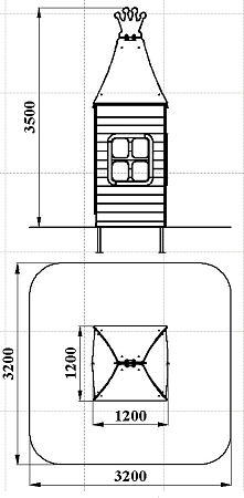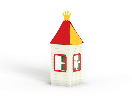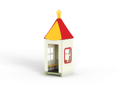 Домик состоит из башни с крышей, фанерных стен с окнами, скамейки и столика.