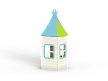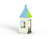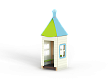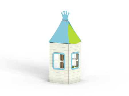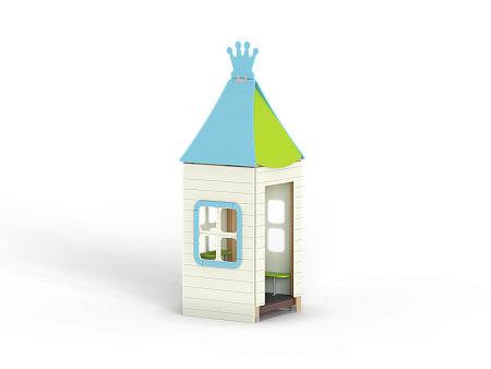 Домик состоит из башни с крышей, фанерных стен с окнами, скамейки и столика.