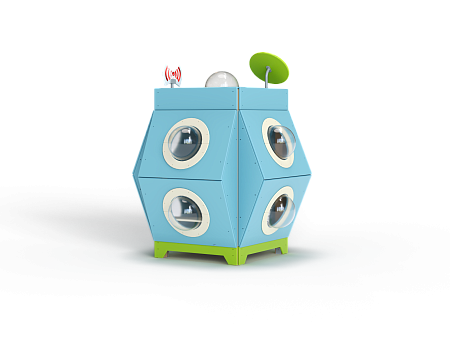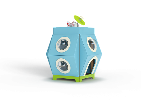 Домик состоит из башни с объёмными геометрическими ограждениями, на которых расположены пластиковые иллюминаторы и один вход. Крыша домика имеет один пластиковый иллюминатор и два декоративных элемента в виде антенны и радара. Внутри домика расположена скамейка и комплект детских счет.