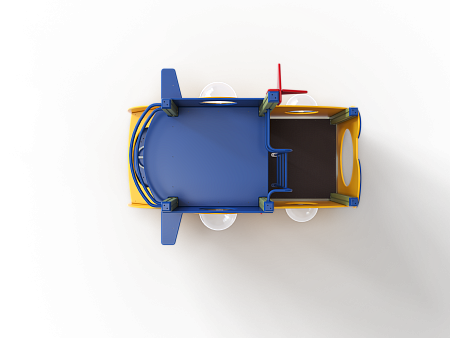 Домик скомпонован в форме подводной лодки, состоит из двух спаренных башен и одной радиусной полубашни, являющейся передом подводной лодки. Центральная башня - двухъярусная, имитирует рубку подводной лодки. Ограждениями первого яруса являются фанерные листы с вырезами-лазами. На задней части первого яруса два ограждения с пластиковыми иллюминаторами. Переход с первого яруса на второй обеспечен лестницей металлической, крепящейся снизу к полу первого яруса, сверху крепится к столбам башни. Второй ярус огражден фанерными ограждениями с пластиковыми иллюминаторами и дуговыми металлическими перекладинами.