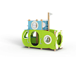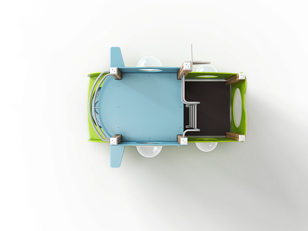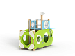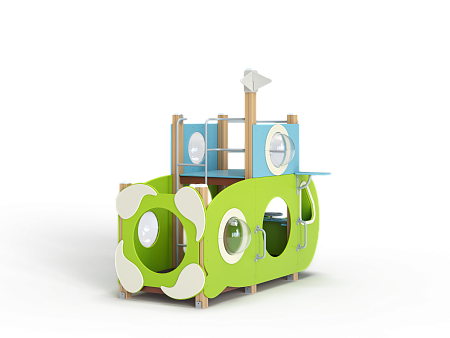 Домик скомпонован в форме подводной лодки, состоит из двух спаренных башен и одной радиусной полубашни, являющейся передом подводной лодки. Центральная башня - двухъярусная, имитирует рубку подводной лодки. Ограждениями первого яруса являются фанерные листы с вырезами-лазами. На задней части первого яруса два ограждения с пластиковыми иллюминаторами. Переход с первого яруса на второй обеспечен лестницей металлической, крепящейся снизу к полу первого яруса, сверху крепится к столбам башни. Второй ярус огражден фанерными ограждениями с пластиковыми иллюминаторами и дуговыми металлическими перекладинами.