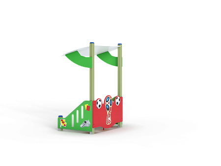 Беседка с художественным оформлением в футбольной тематике..Беседка состоит из двух ограждений, стенки с тремя скамейками и крыши.